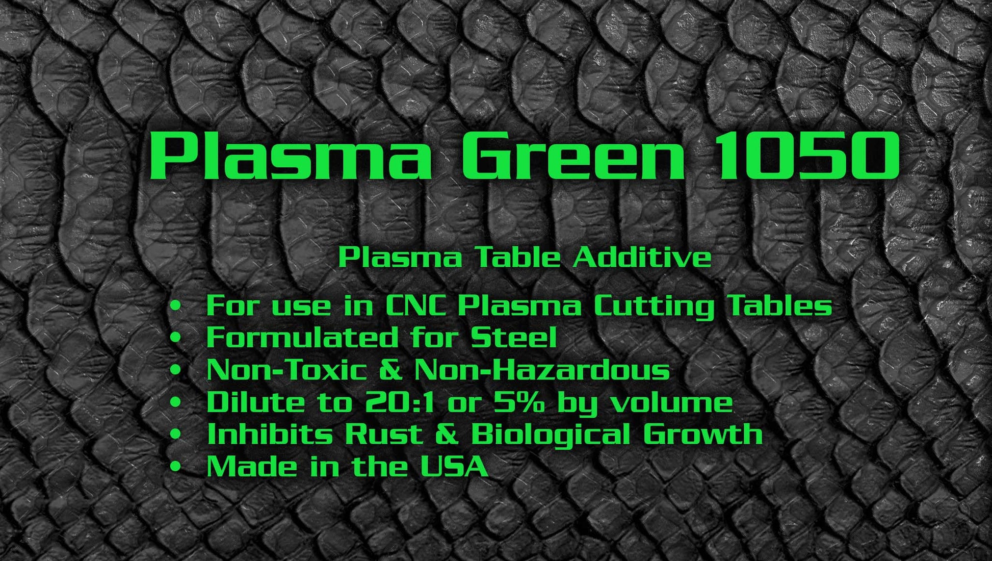Plasma Green 1050 protects cutting tables from rust & biological growth, and is our most economical table additive. Use at 20:1 ratio or 5% by volume. Primarily formulated for steel, this product will not produce build-up of solids on slats, table pan sides, or plasma torch tip, and will not prematurely degrade plasma torch consumables. Plasma Green 1050 is non-toxic & non-hazardous, and can be shipped via UPS in 1, and 5 gallon sizes. 55 gallon drums will ship via common carrier. Plasma Green 1050 has been in our product line for well over 10 years, and has been a proven product for businesses, schools, government & military customers. When processing aluminum, we recommend Plasma Green 9010 which is specifically formulated for aluminum, and will not produce hydrogen gas. All our products are manufactured & shipped in the U.S. from our facility in Indiana.